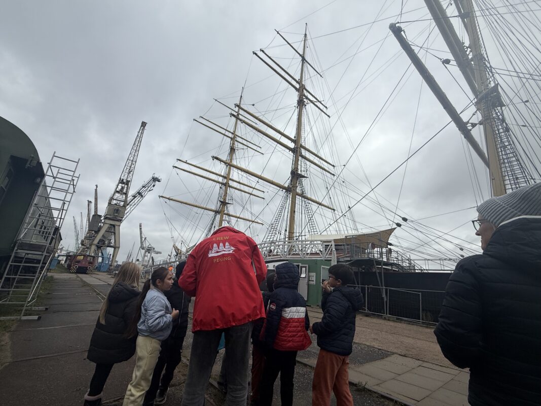 Ein besonderes Highlight war der Besuch des historischen Segelschiffs „Peking“, das bereits 1911 erbaut wurde und heute aufwendig restauriert im Hafenmuseum besichtigt werden kann. Die Kinder waren sofort begeistert – besonders, als sie die beeindruckende Aussicht vom Deck aus entdeckten: Auf der anderen Seite der Elbe konnten wir die Elbphilharmonie sehen!